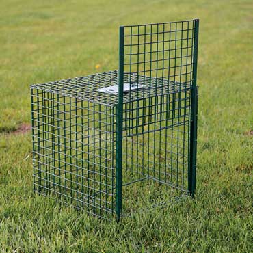 Krähen-/Elstern-/Eichelhähr-Schlagnetzfalle für den LebendfangDie Falle wird mit einem Erdanker auf dem Boden befestigt und mit Gras leichtverblendet.